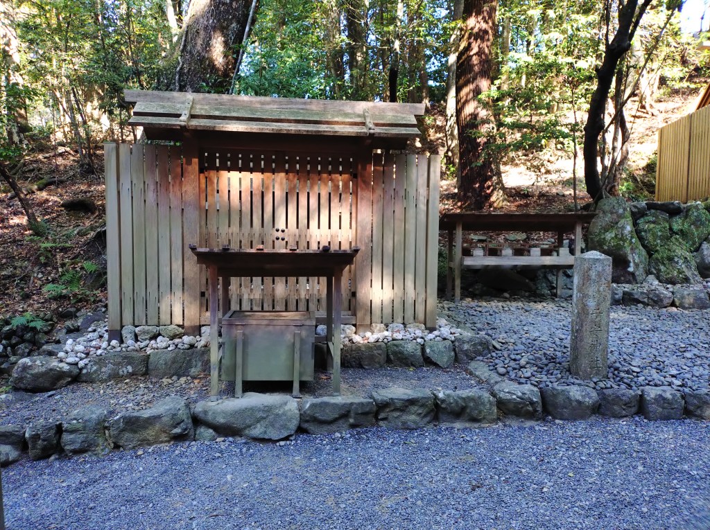 内宮の最初の鳥居をくぐり、橋を渡って、右へは行かずに真っ直ぐ行くとあります。なかなか見つけにくい所ですが、是非御参りください。