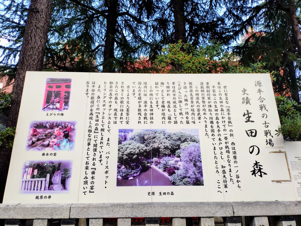 ここは、源平合戦の戦場となった有名な森で、寿永三年(1184)2月には、平知盛を大将とする平家軍が生田の森に陣を構え、一の谷から生田の森へかけて一帯が戦場となるなど、歴史的に由緒ある森なのです。